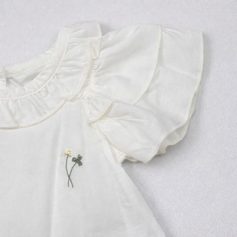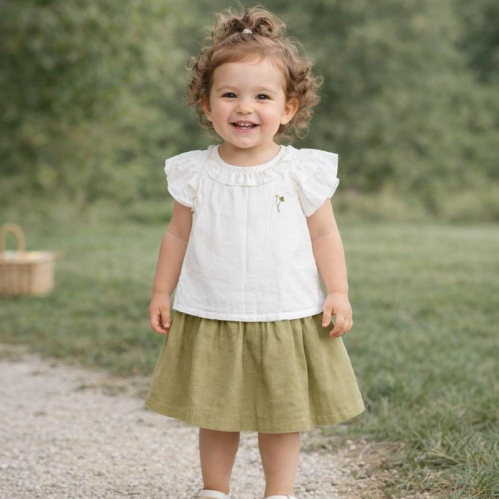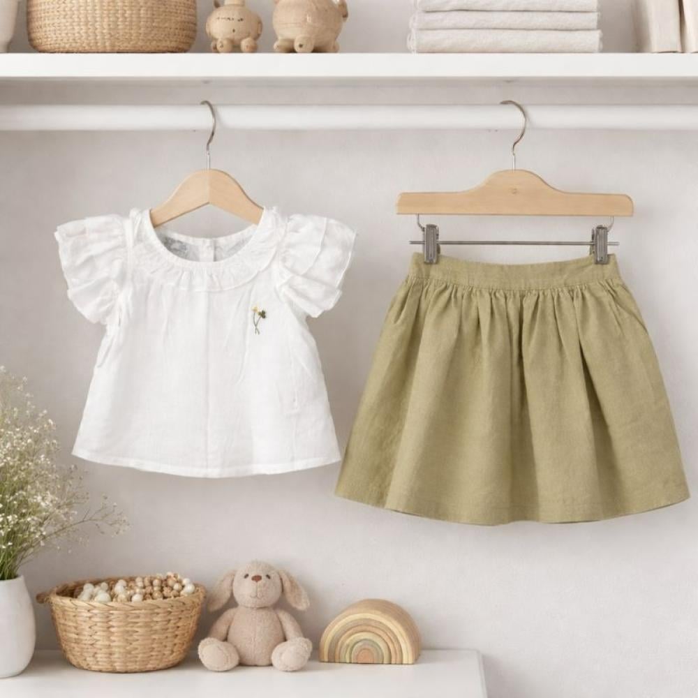 - تصميم المنتج: يتكون الطقم من بلوزة بيضاء جذابة بتصميم ناعم وأنيق، تتميز بأكمام منفوشة تضيف لمسة أنثوية محببة، مع حواف مزينة بالكشكش تعكس روح الطفولة المرحة.
